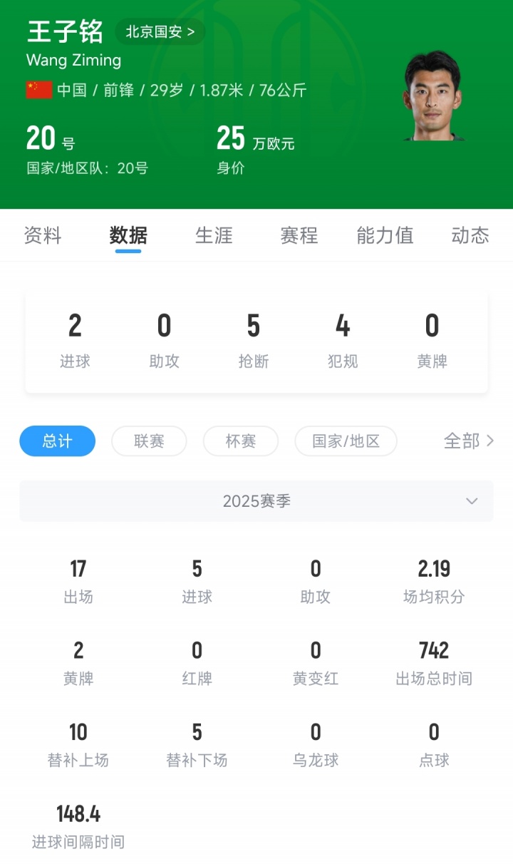 在刚刚结束的2025赛季中,王子铭代表北京国安出战17场比赛,打进5球,他与北京国安的合同将在今年年底到期。据此前报道,合同结束后国安与王子铭不会续约。